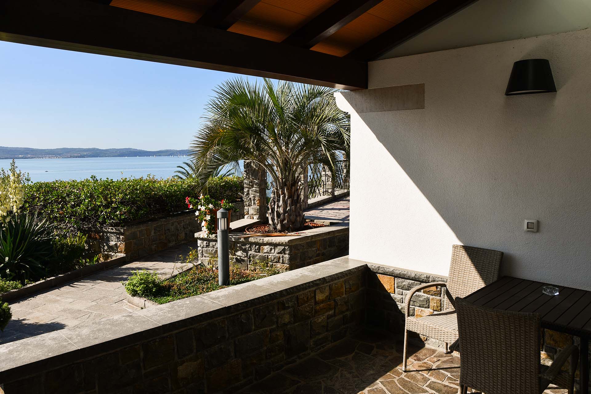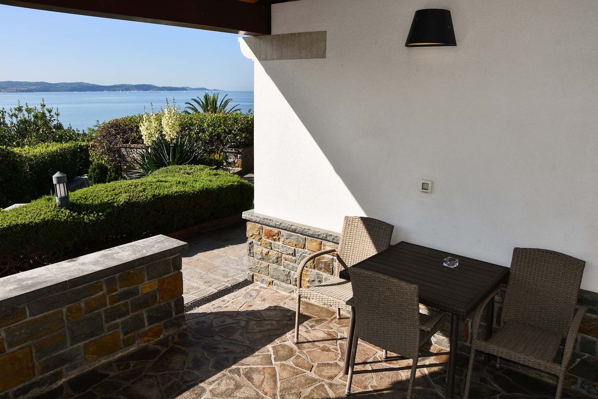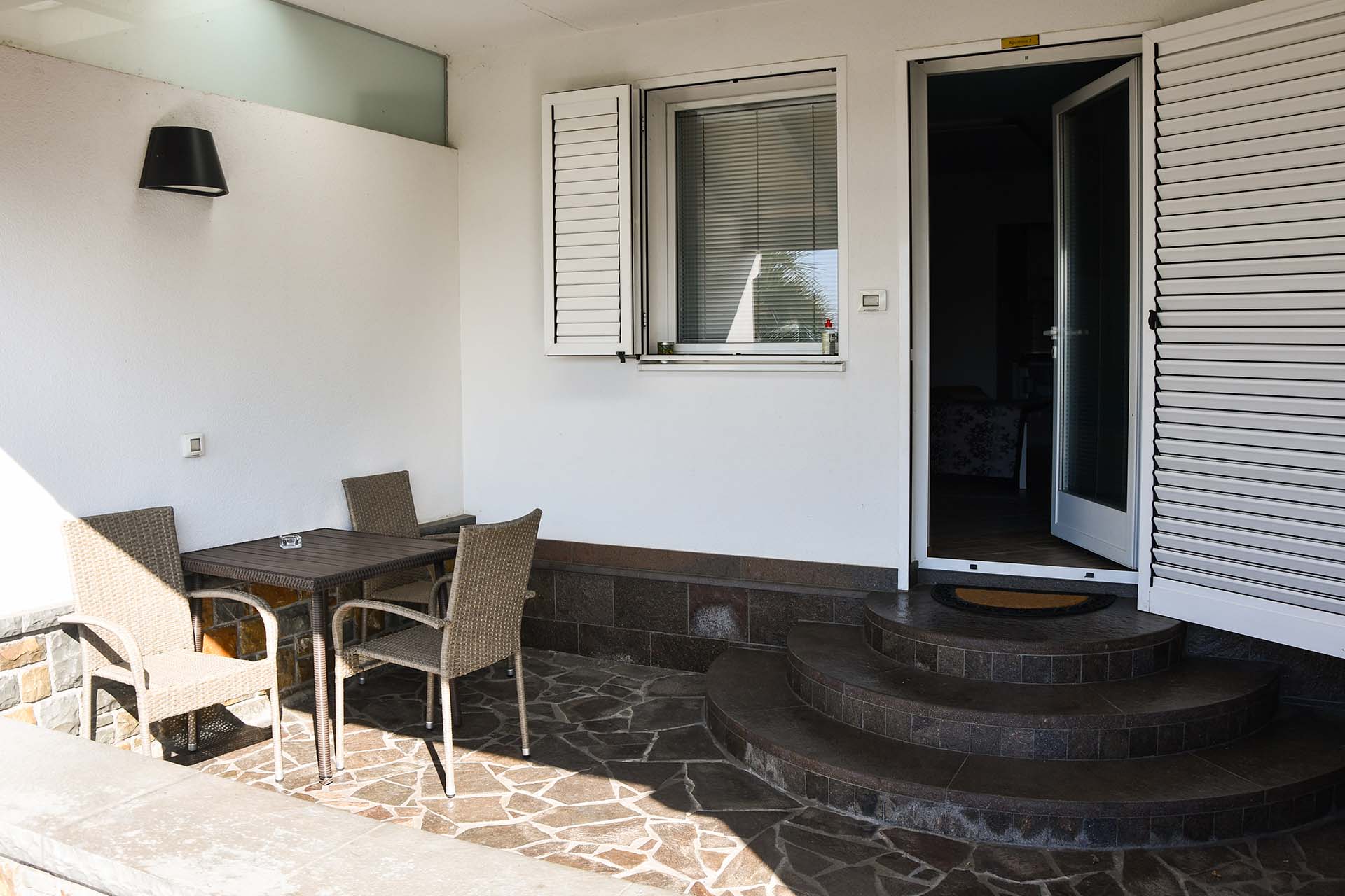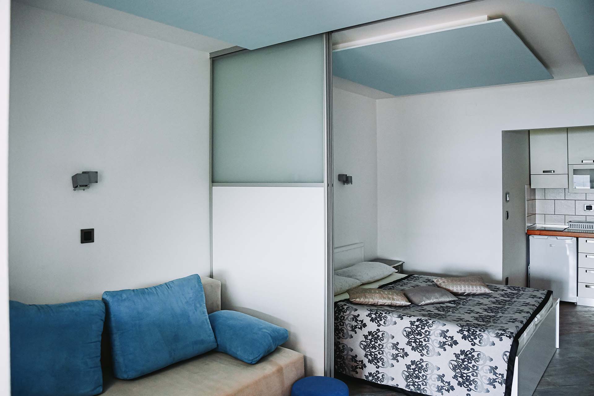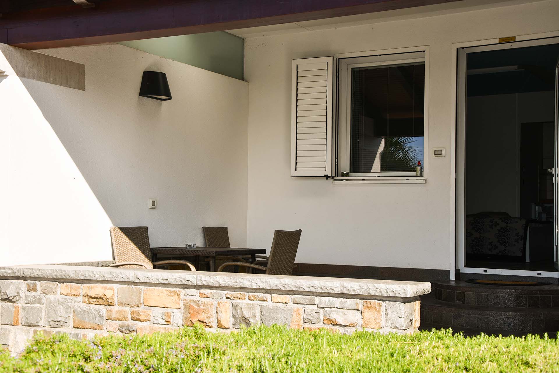 Apartma meri 32m2 in je namenjen dvema osebama (z možnostjo priprave treh postelj). Kuhinja je opremljena s hladilnikom, napo in dvema keramičnima kuhalnikoma. V apartmaju je televizija, internet, klimatska naprava. Apartmaji se nahajajo v pritličju, vsak ima teraso velikosti 12m2 s pogledom na morje. Ob apartmajih so bazen z ležalniki, tuš, parkirišča (tudi pokrita). Dostop do plaže cca 2 min.